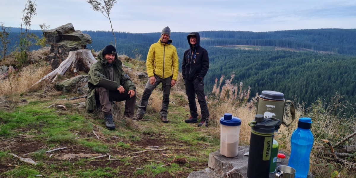 Maik kenne ich schon seit Jahren. Ich schätze ihn sehr als Mensch. Ich bewundere seine Erfolgsgeschichte als Mister Universe und begnadeter Coach und Trainer. Ich bin begeistert von seinem Erfahrungsschatz, seiner Expertise, seinem Know-how. Über ihn habe ich seine Mentoren Jana und Andreas Müller vom Vitalzentrum Schwarzenberg kennengelernt. Zusammen organisieren sie schon seit Jahren Waldausflüge im Erzgebirge, rüber nach Tschechien. Ich wollte schon mehrmals mit, hatte aber immer selber Events. Jetzt hat es endlich geklappt und ich habe als „Steinzeitreise“ gleich die „Wolfstage“ gebucht. Vier Tage und drei Nächte komplett draußen – Sauerstoff pur und die unterschiedlich duftenden Wald-Terpene, brauner Boden, bunte Blätter, grüne Wiesen und zum Glück meist blauer Himmel bzw. Sternenhimmel.